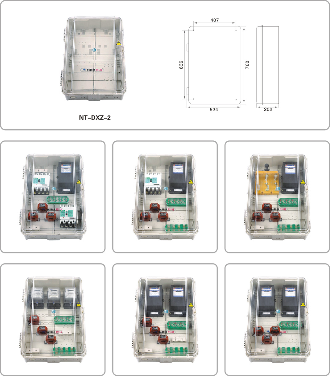 NT-DXZ系列三相多功能動力計量箱是一種功能多樣化、防竊電透明化的新一代計量配電箱,可滿足不同用戶的多種需求。具有體積小、功能多變、組合方便等特點,箱內空間可依據客戶需求設置各類電表、電流互感器、低壓熔斷器、低壓斷路器、進出線端子、聯(lián)合接線盒的安裝位。底座上設有各類安裝槽,方便安裝各類原件,并可以在預付費電表、開關相應的位置設置IC卡窗口和開關窗口。