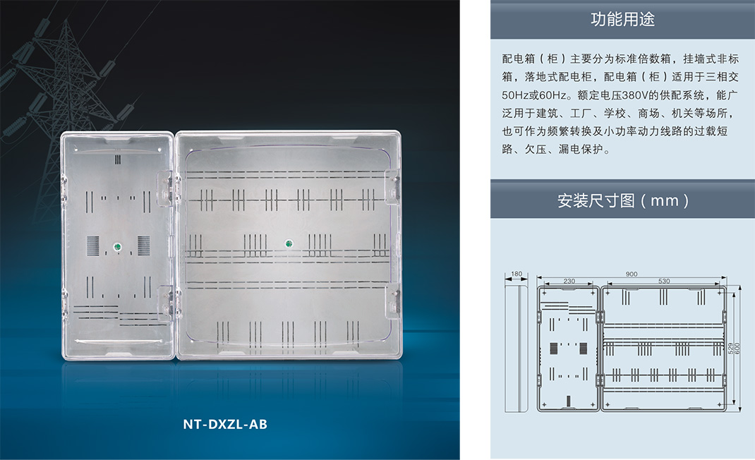 電表箱生產(chǎn)廠家-浙江南騰電氣有限公司研發(fā)的NT系列透明塑料電表箱,采用進(jìn)口聚碳酸酯(PC)和阻燃ABS工程塑料制成。具有抗沖擊、抗老化、耐腐蝕、透明度高、抗紫外線、安裝方便等優(yōu)點(diǎn),并且具有用電安全保護(hù),用戶分離控制,數(shù)據(jù)采集, 防盜電等功能。產(chǎn)品適合安裝電子式、機(jī)械式、智能IC卡預(yù)付式、智能多費(fèi)率式電表。南騰NT系列透明塑料電表箱自推出市場(chǎng)以來(lái),憑借其完美的設(shè)計(jì)理念,在電表箱行業(yè)遙遙領(lǐng)先。